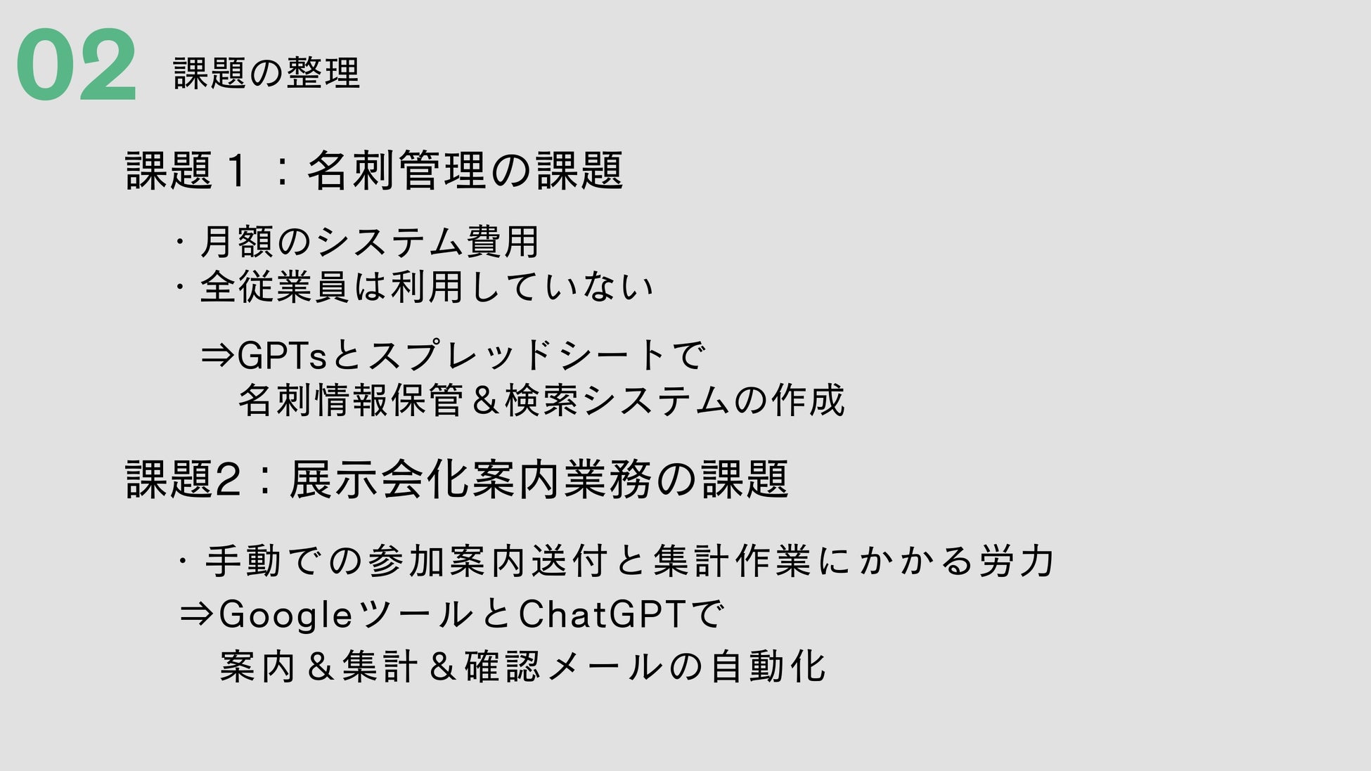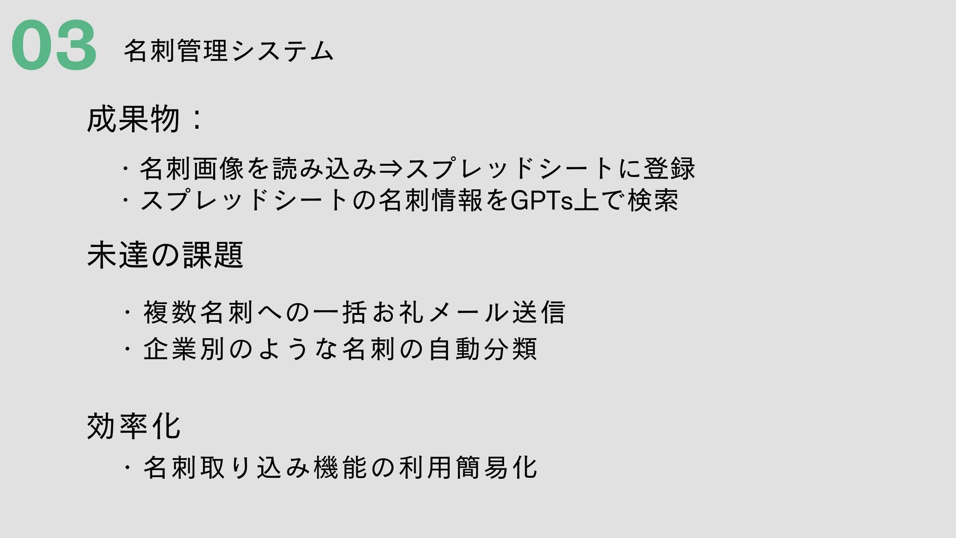 名刺情報管理の効率向上・費用削減にフォーカス。高額かつ煩雑になっていた名刺情報管理システムを置き換えることを目的として、チャット対話で名刺情報を読み書きするシステムを構築。