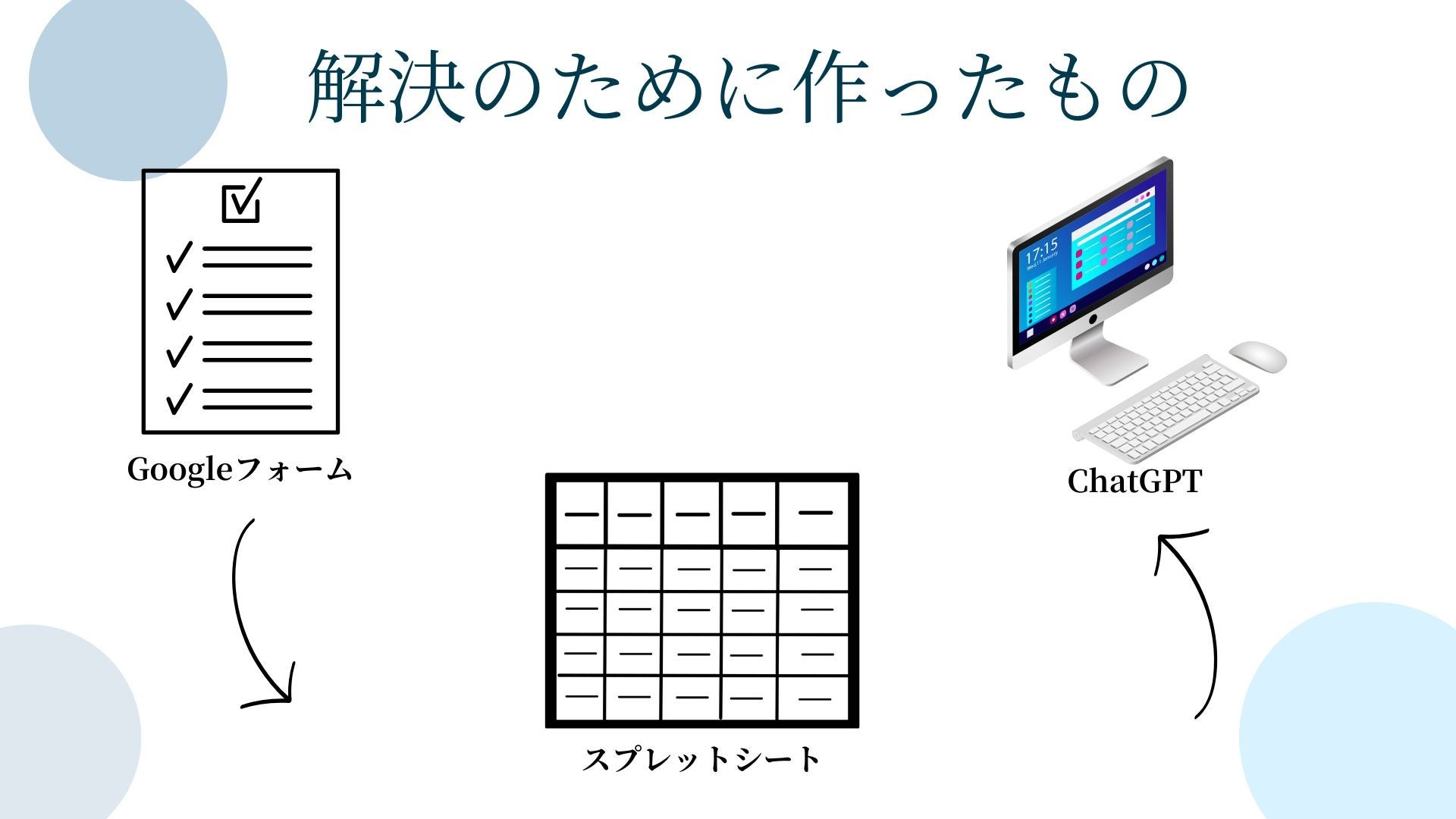 使用ツール:Googleフォーム、 Googleスプレッドシート、 ChatGPT(OpenAI API)