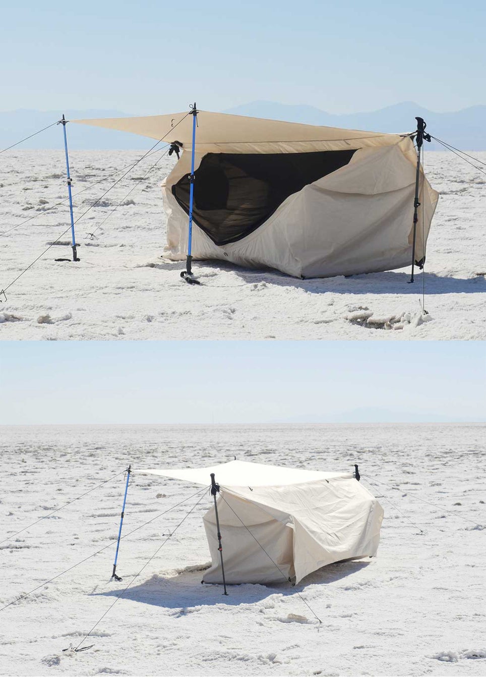 トレッキングポールまたはそれにかわるテントポールや枝さえあれば、地面に設営することができます。