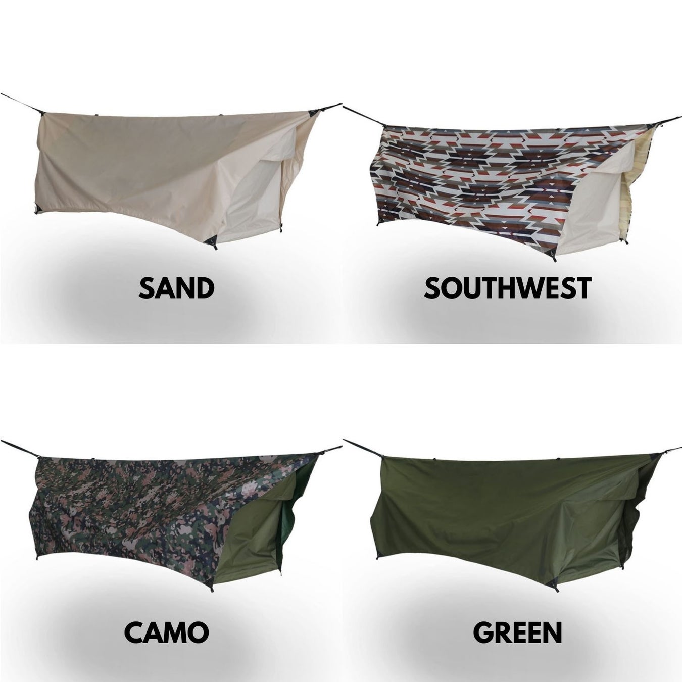 パッケージ内容:蚊帳付きハンモック、レインフライ、エアマット、バンティングバナー、ウェルカムマット、スプレッダーバー、ツリーストラップ、ペグ、ガイロープ、収納ポーチ