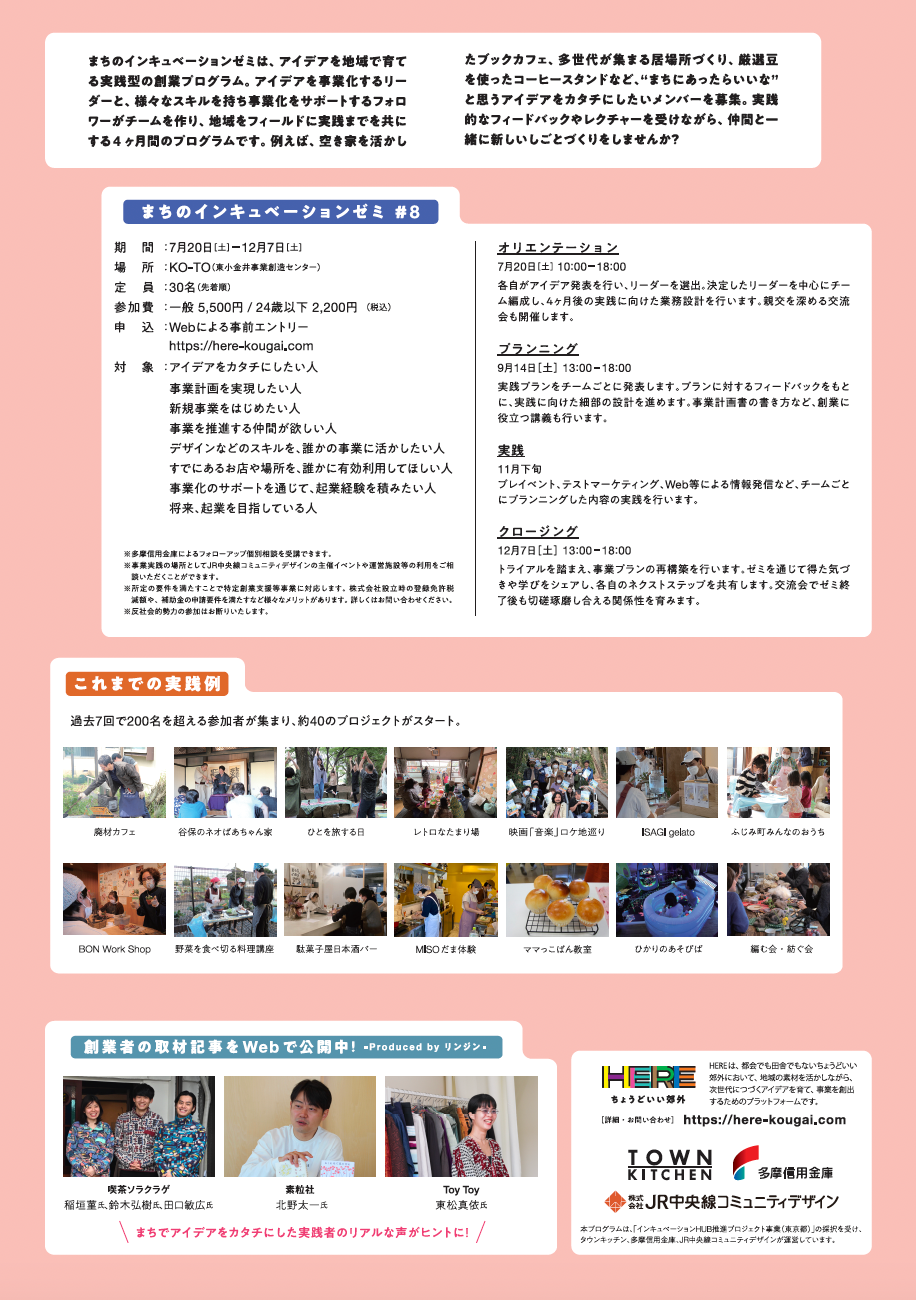 まちのインキュベーションゼミは、アイデアを地域で育てる実践型の創業プログラム。アイデアを事業化するリーダーと、様々なスキルを持ち事業化をサポートするフォロワーがチームを作り、地域をフィールドに実践を共にする4ヶ月間のプログラムです。2019年にスタートした本ゼミは、今回で8回目。過去7回で200名を超える参加者が集まり、約40のプロジェクトがスタートしました。