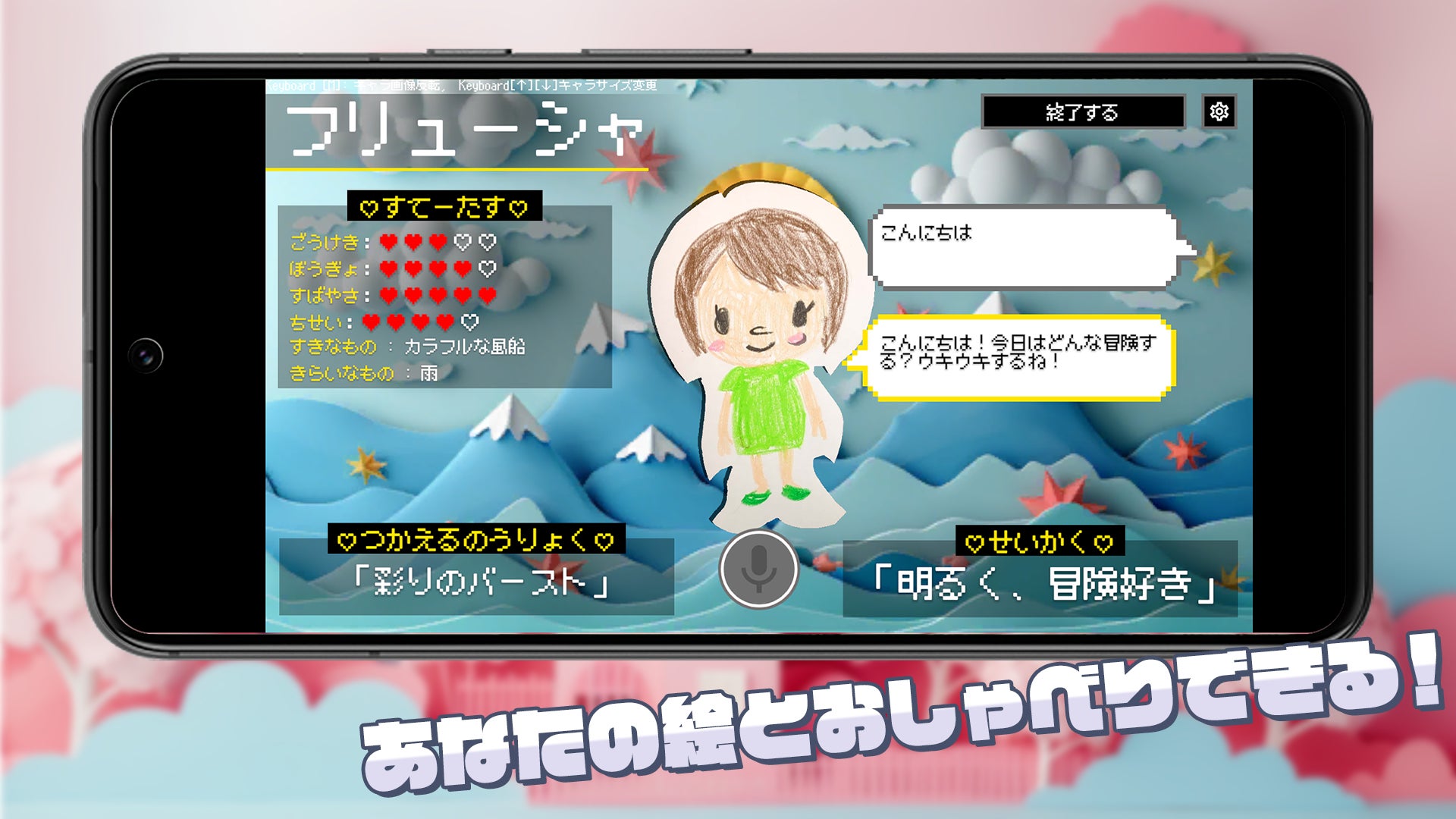 お子様が夢中になって描いた絵が、AIの力で命を吹き込まれ、会話を楽しむことができます。お絵描きが大好きな子どもたちに、まるで夢のような体験をお届けします。