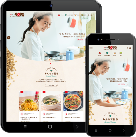 当サイトではメンバーがごまに関するレシピ・画像・活用Tipsなど様々なアイデアを投稿できる「みんなで創る」、商品のお役立ち最新情報を届ける「読む」、キャンペーンやアイデア募集などの「楽しむ」コンテンツを展開しています。食生活や健康をテーマに、メンバーやかどやのコメントに対して感想を投稿したり、アイデアを足し合ったりすることでメンバー同士の新たな発見だけでなく、インタラクティブなコミュニケーションの中からかどやがメンバーのリアルな声の発見と活用も目指しています。