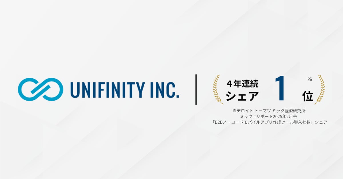 株式会社ユニフィニティー(東京都渋谷区、代表取締役曽良俊介、以下「当社」といいます)は、当社が提供するノーコードモバイルアプリプラットフォーム「Unifinity」が、株式会社デロイト トーマツ ミック経済研究所が発行する「ミックITリポート2025年2月号」B2Bノーコードモバイルアプリ市場(2024年度)において導入社数シェア1位(810社、シェア19.4%)となりましたのでお知らせいたします。