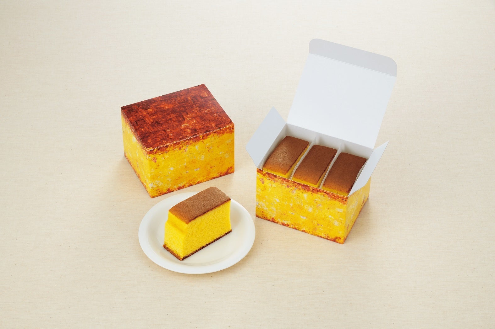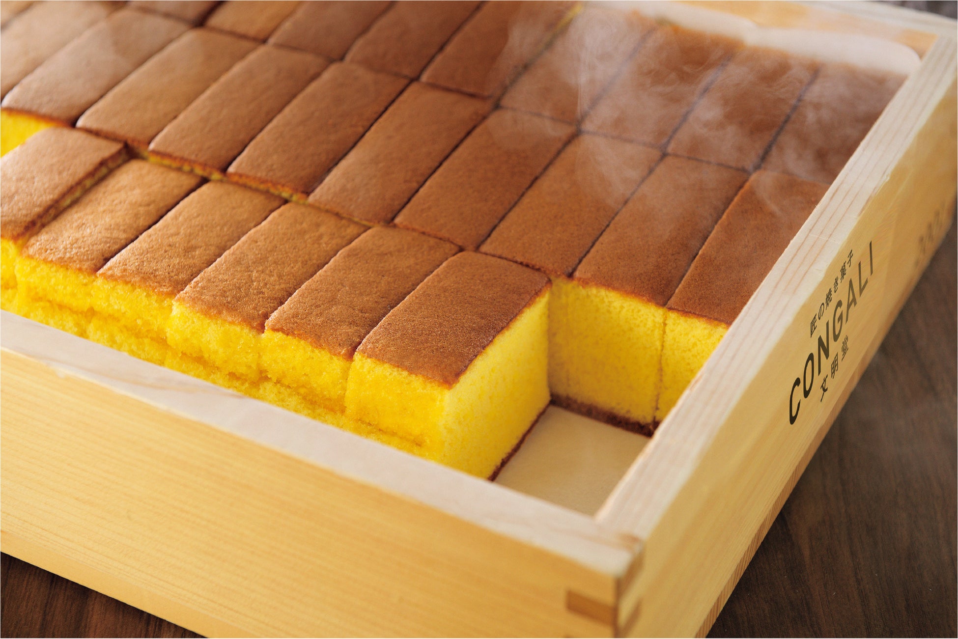 通常、カステラは釜から出した後に木の番重(菓子を入れる容器)に入れて一晩寝かせていますが、釜出しカステラは出来立てでも美味しい配合を研究し、開発しました。伊勢丹新宿店より徒歩10分ほどの場所にある「文明堂新宿工房」で1日3回カステラを製造し、焼き上げたばかりの温かいカステラを大きめのサイズにカットし、木番重に乗せて新宿伊勢丹店へ運びます。