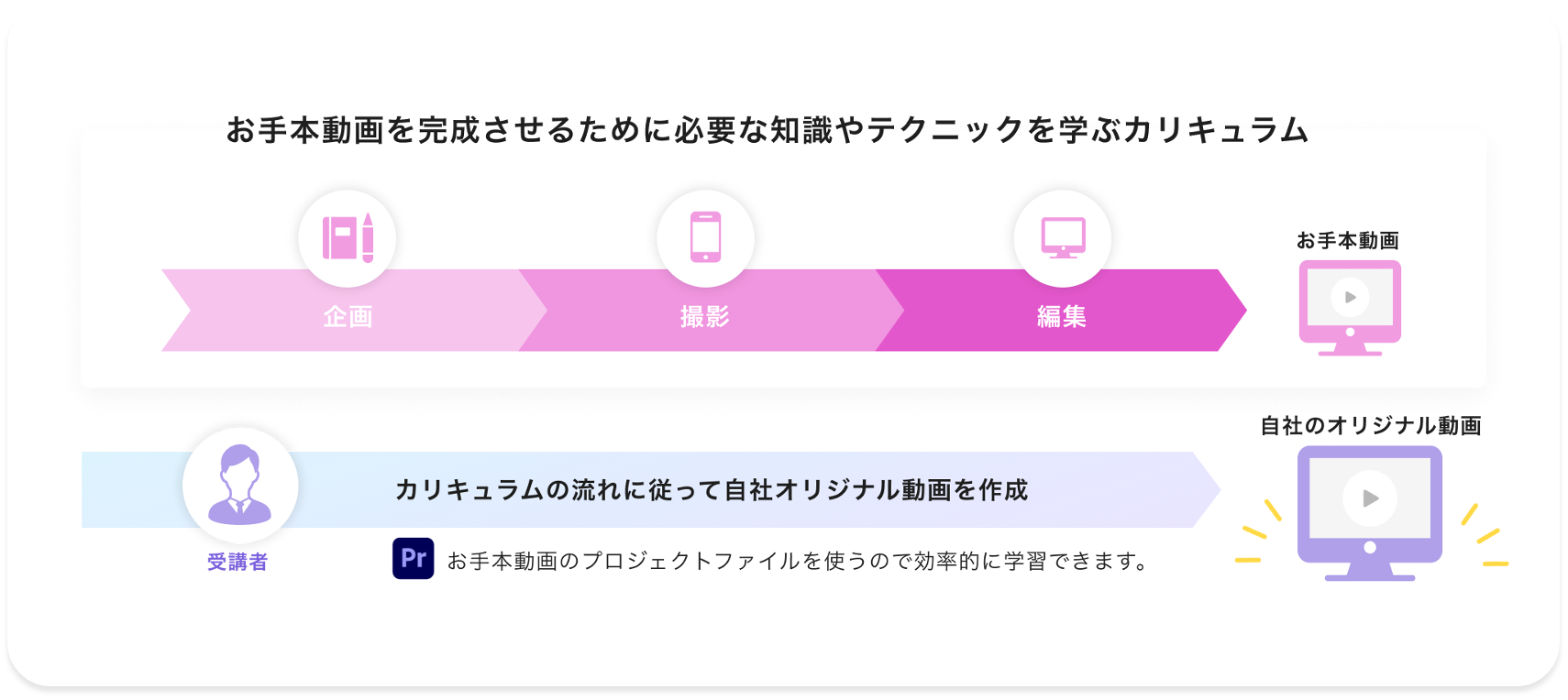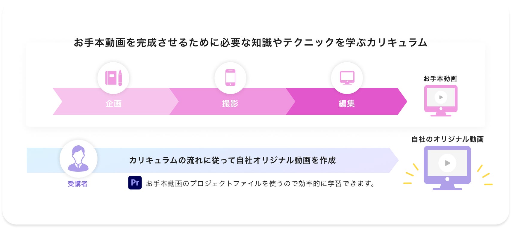 制作に際して、映像制作に必要な企画・撮影・編集の手順や知識を身につけることができる、プロの動画クリエイターが監修・制作したカリキュラム(以下、本カリキュラム)を提供。