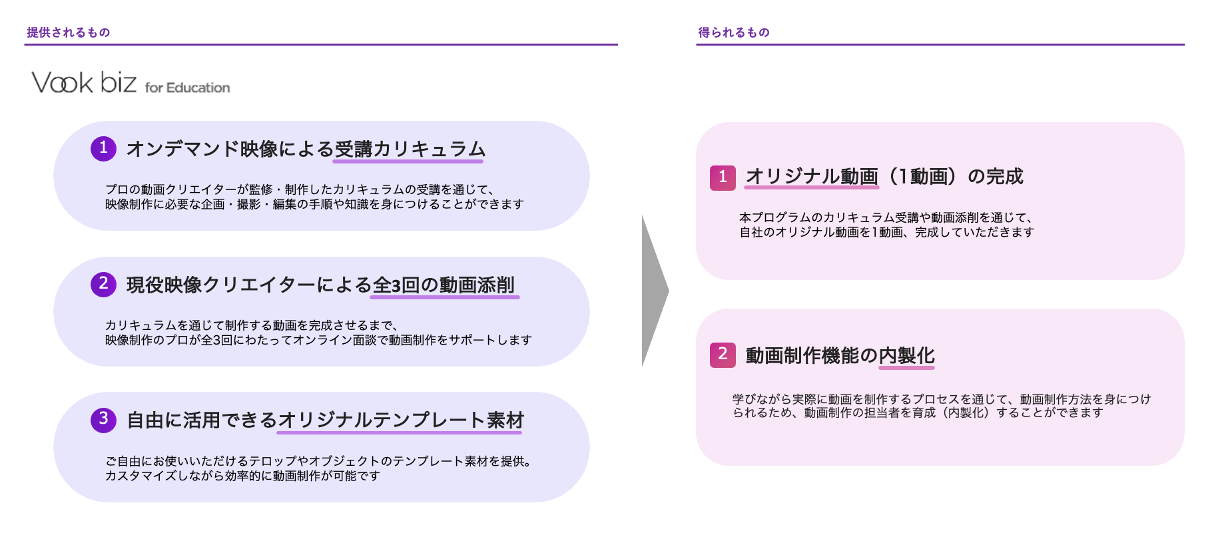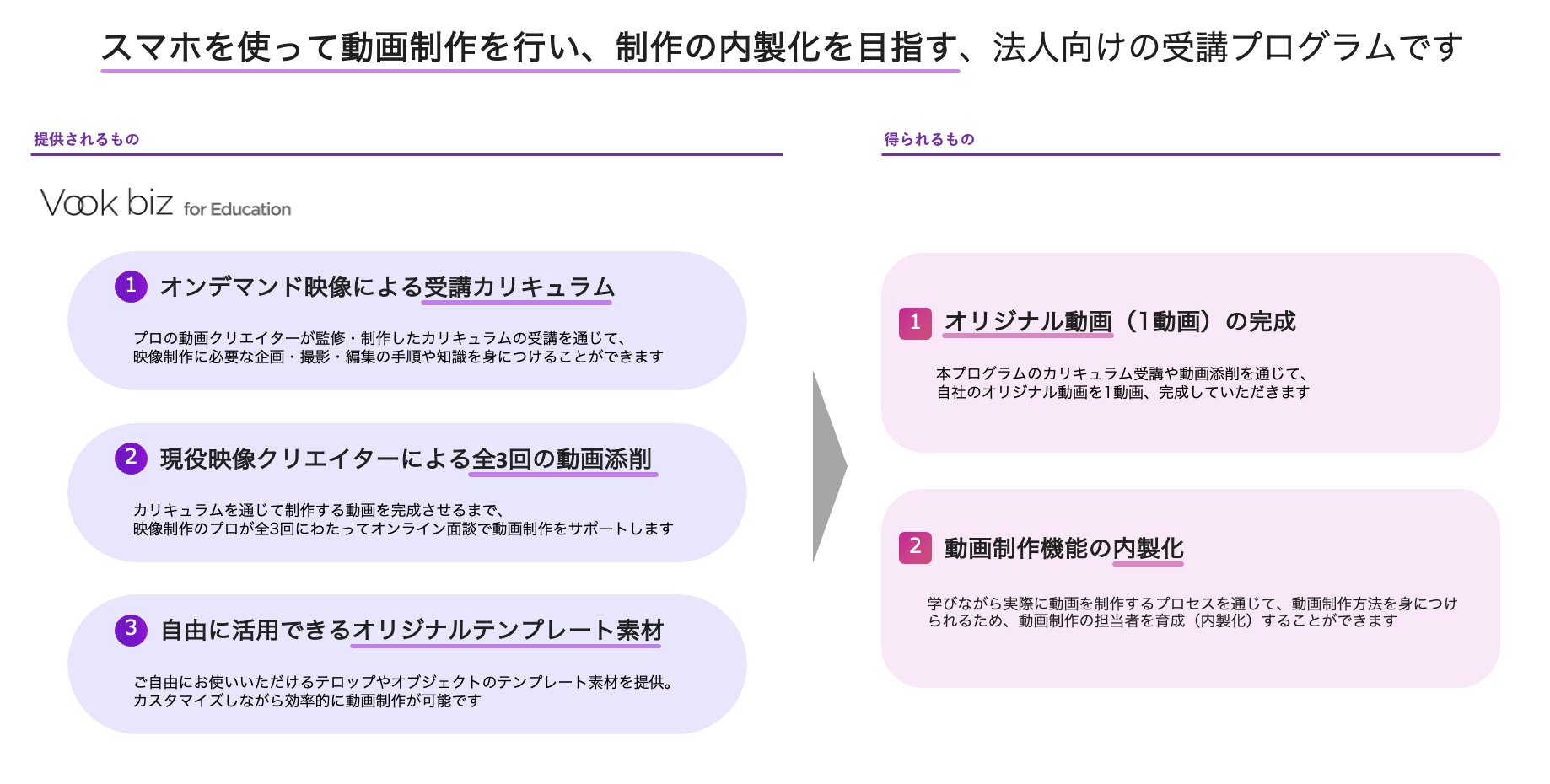 本サービスは、Vook schoolの特長である「映像制作の企画から撮影、編集までの体系だった学び」をベースに、撮影をスマートフォン活用とすることで、動画制作の障壁を下げ、企業における動画活用、内製化支援をさらに後押しします。