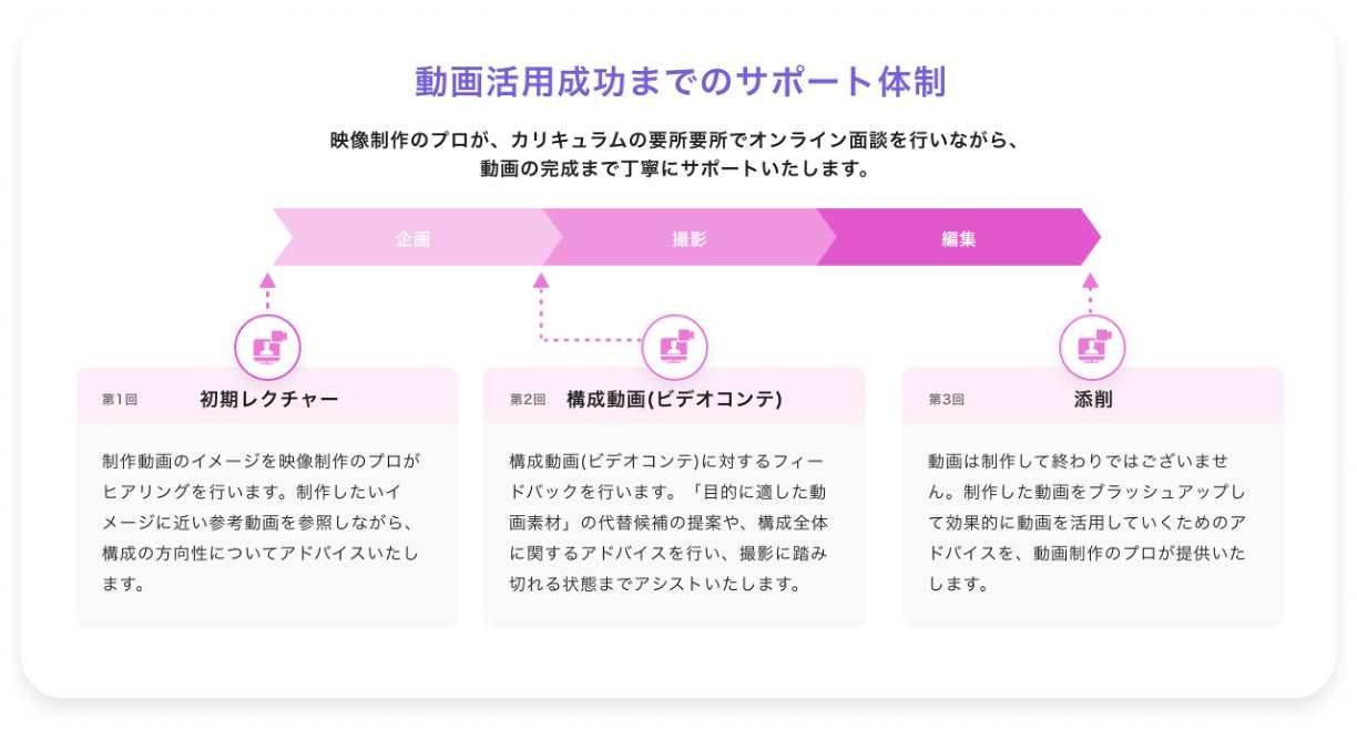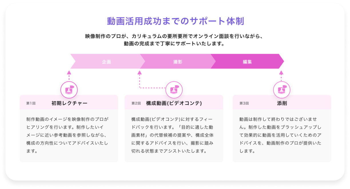 本サービスは、1.オンデマンド映像による受講カリキュラム、2.現役映像クリエイターによるオンラインサポート、3. オリジナルテンプレートなどの素材の提供、の3点を行います。これら3つを活用し、実際に自社のオリジナル動画を制作することで動画制作に必要な知識と技術を身につけられる、動画制作の内製化を進めるための受講プログラムです。