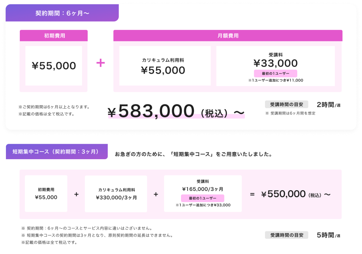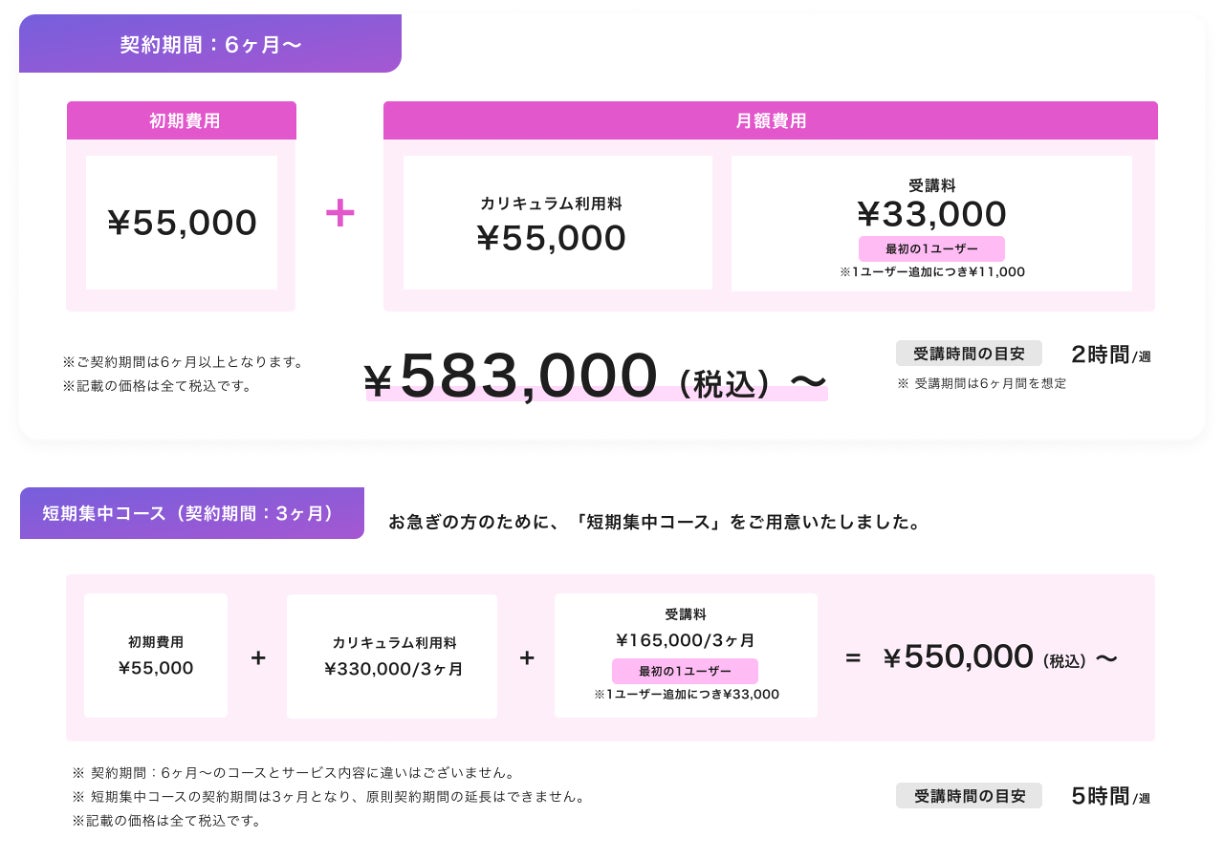 ・通常コース(契約期間:6ヶ月〜):583,000円(税込)〜