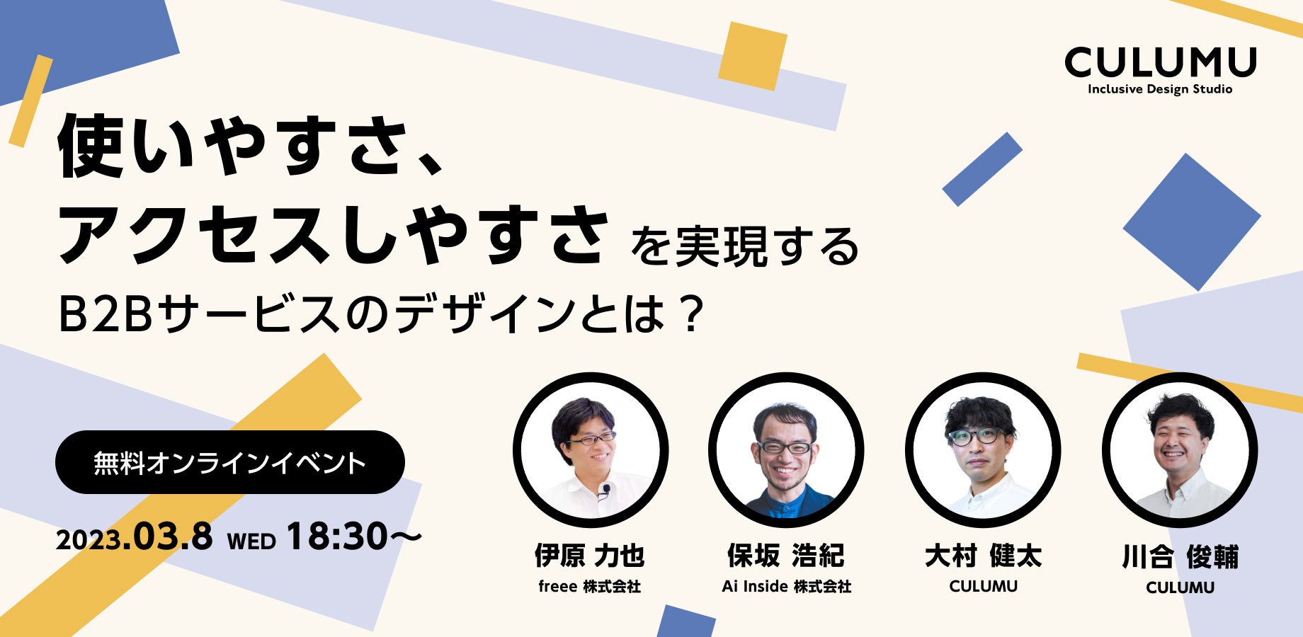 多様な人々・社会と共創する インクルーシデザインスタジオ CULUMUは、より幅広い人々が使えることが求められていくB2Bサービスおいて、デザインの力を使うことでどのようにより使いやすいものにできるか学ぶことができる無料オンラインセミナーを3/8(水)の18:30より開催します。