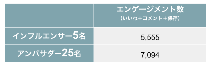 また、エンゲージメント数(いいね+コメント+保存)もSnapmartアンバサダーが7,094に対しインフルエンサーは5,555と、アンバサダーの方が多く獲得できています。