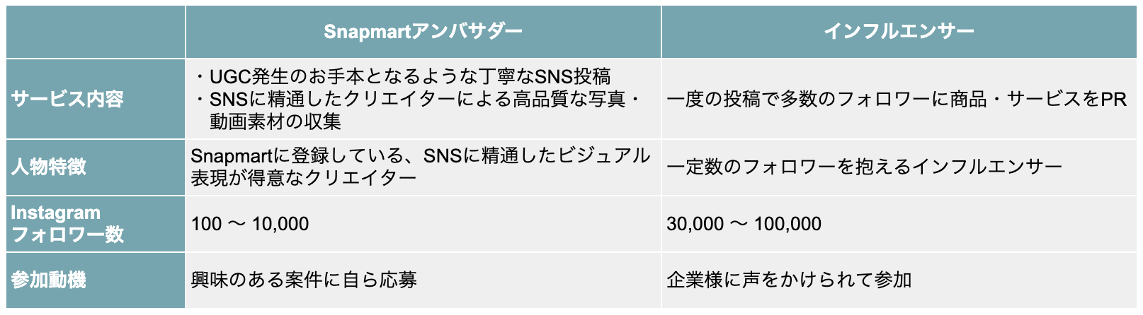 ■Snapmartアンバサダー / インフルエンサーの主な違い