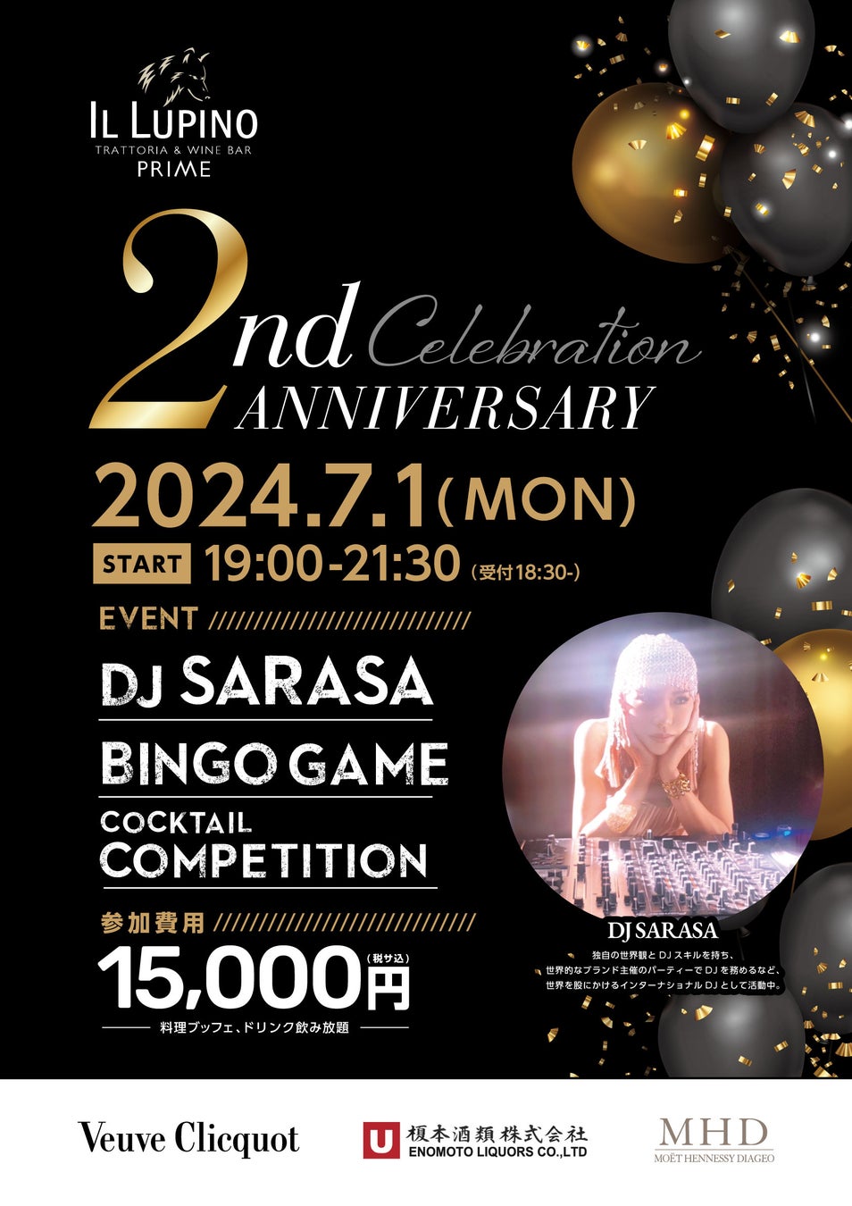 日ごろのご愛顧に感謝を込めて7月1日(月)19:00より「2nd ANNIVERSARY Special Party」を開催いたします。パーティーでは世界で活躍する「DJ SARASA」氏をお招きし、音楽とビンゴ大会等のスペシャルイベントをお楽しみいただきながら、IL LUPINO PRIMEの本格イタリアンを立食ブッフェ形式でご用意します。