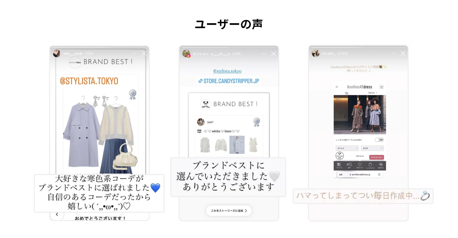 「キャンディストリッパー」は、「相談&提案機能」をはじめ、「スタイル機能」、「スタッフ投稿機能」、「まとめ機能」さらに12月から「ブランドバッジの付与」も追加するなどSTYLISTAの全ての機能を導入いただいております。その結果、ECサイト上で、ユーザーによるコンテンツがより充実し、実店舗のようにブランドとユーザーが活発に交流する独自のコミュニティを構築することに成功しました。ゲーム感覚でコンテンツが作成できる手軽さやそれを見る楽しさが醸成され、ユーザーがファン化し売上につながったといえます。