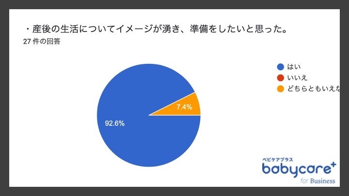 「産後うつ」に関しても家族のサポートによって予防できる可能性があると100%の従業員の方に回答頂いており、正しい知識や情報を出産前に知ることが有用である可能性が示されました。