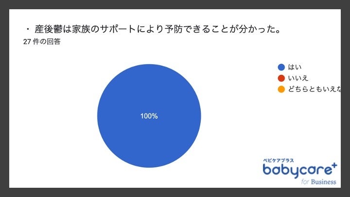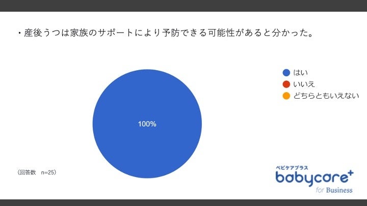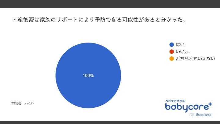 - 100%が「産後うつは家族のサポートにより予防できる可能性があることが分かった」と回答