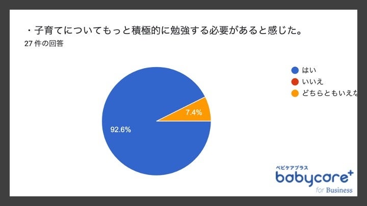 - 92%が「子育てについてもっと積極的に勉強する必要があると感じた」と回答