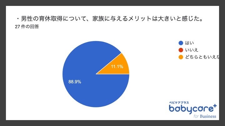 - 88%が「男性の育休取得について、家族に与えるメリットは大きいと感じた」と回答