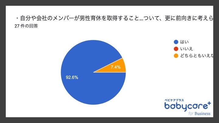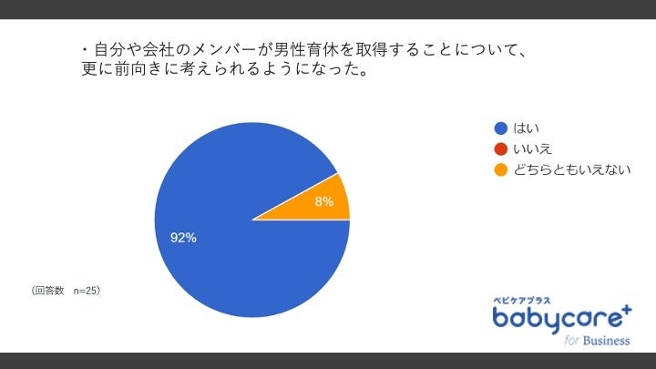 - 92%が「自分や会社のメンバーが男性育休を取得することについて、更に前向きに考えられるようになった」と回答