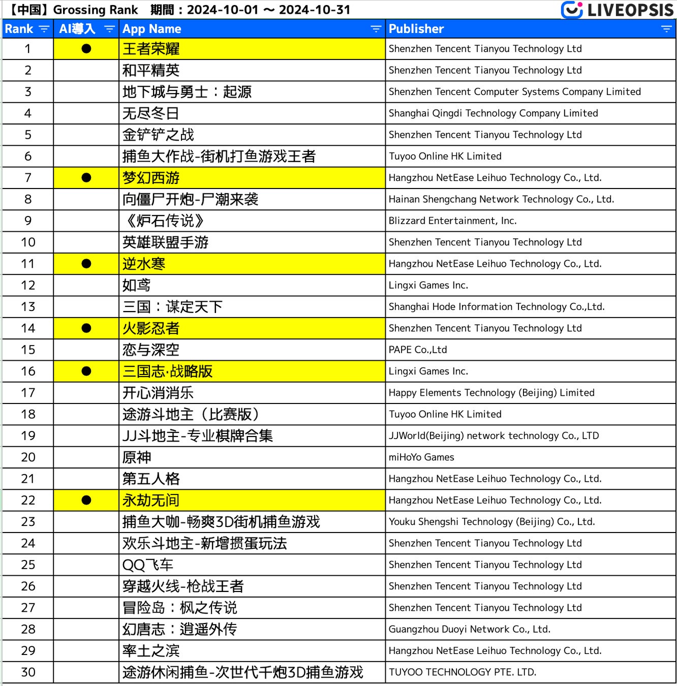10月度の中国App StoreランキングTOP30タイトルのうち、調査時点で生成AIを導入しているとわかっているものだけでも20%となる6タイトルが生成AIを導入していました。