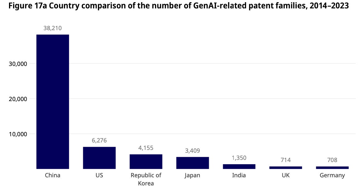 2024年7月にWIPO(世界知識産権機関)が発表した生成AI特許動向報告書によると、2014年~2023年にかけて中国は3.8万件を超える生成AI特許申請を行っています。