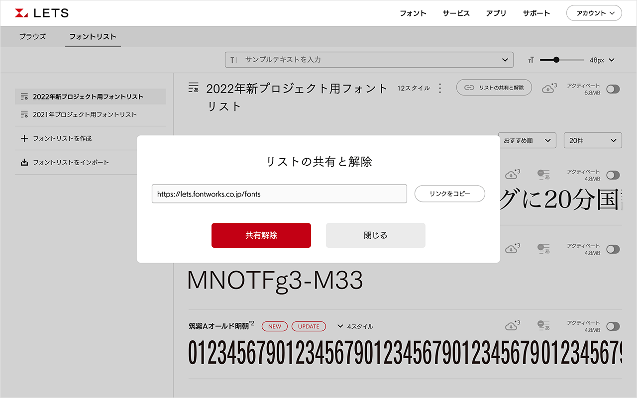 フォントワークス『LETS』より、新機能「フォントリスト共有機能」提供開始。無料会員登録で特典フォントも多数使える