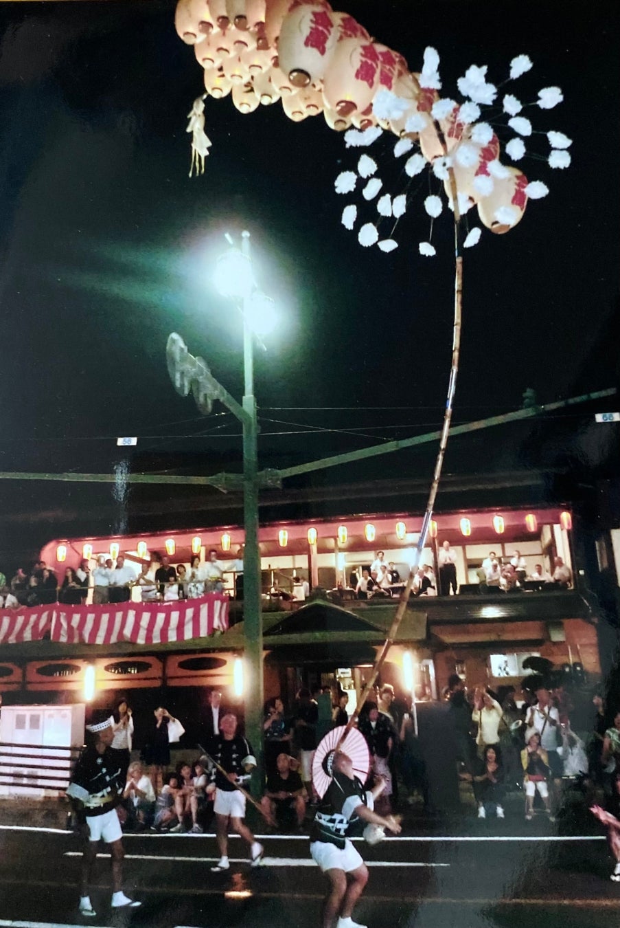 志田屋2階特別桟敷の前であがる竿燈にあわせた祭り担い手の実況・解説