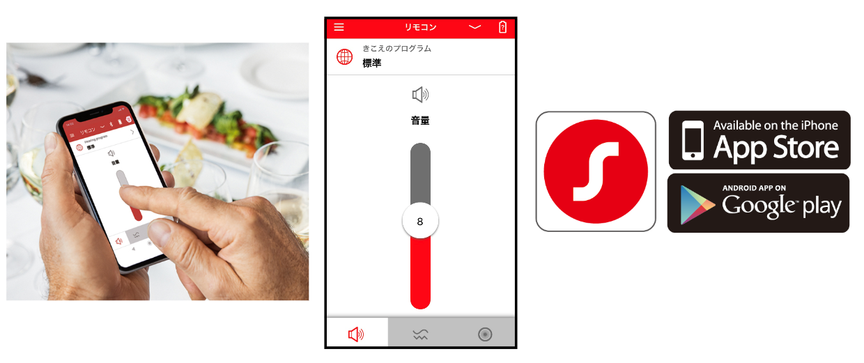 Silk Xは「シグニア アプリ」を利用することで、補聴器の「音量」「サウンドバランス」の調節、「プログラム」の切り替え等が可能です。いつでも好きなタイミングで調節・切り替えができるので、様々な環境に合わせて使用することができます。