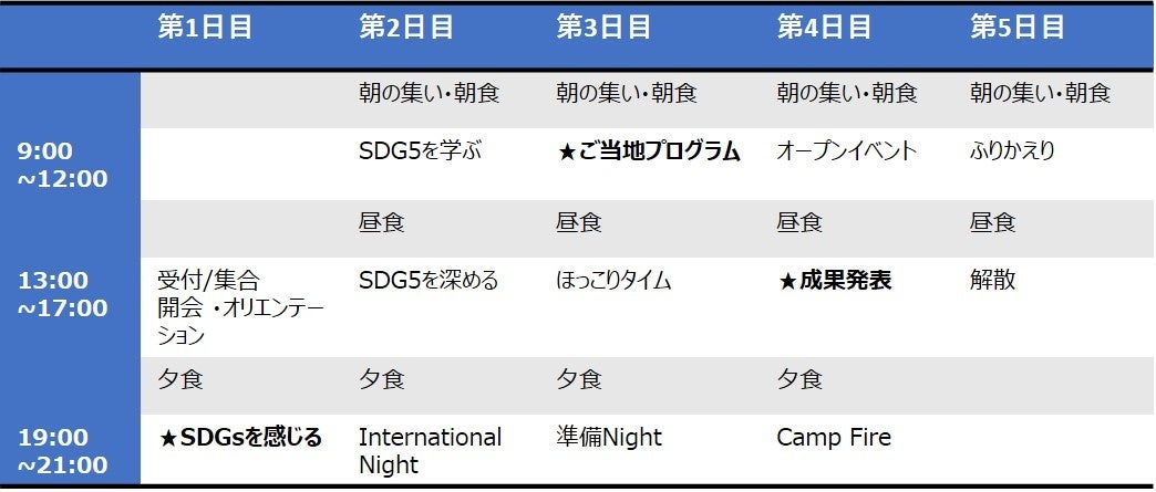 このキャンプでは、全国各地から集まった中高生年代の少女と女性が、「よりよい社会」を作るために自身が何ができるかを発見し、SDGs目標5「ジェンダー平等の実現」の達成のために行動を起こせるようになることを目指します。