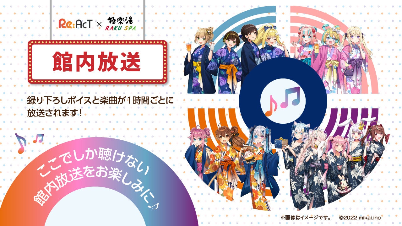 株式会社mikai(本社:東京都千代田区、代表取締役:上村隆博)が運営するバーチャルタレント事務所「Re:AcT」は、株式会社極楽湯(本社:東京都千代田区、代表取締役社長:新川 隆丈)が運営する「極楽湯・RAKU SPAグループ8店舗と中外鉱業株式会社(本社:東京都千代田区、代表取締役社長:芳賀一利)と共同主催でのコラボキャンペーン“秘湯で奏でる極楽ライブ”を開催いたします。