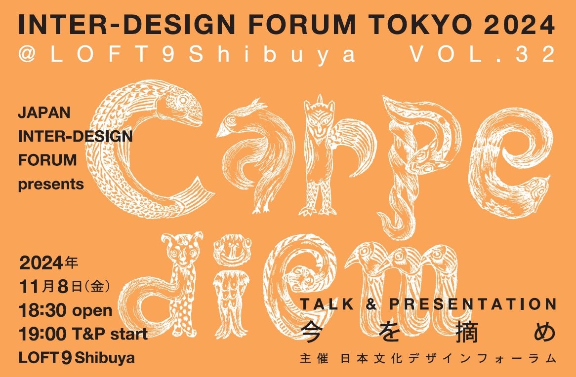 アート、デザイン、建築、科学、文学、食、音楽など多彩な分野の専門家がジャンルの垣根を超えて活動している一般社団法人日本文化デザインフォーラム(理事長:水野誠一、以下JIDF)は、様々な分野の著名人によるトークイベント『Carpe diem=今を摘め』VOL.32~対談シリーズ・5~を、2024年11月8日(金)にLOFT9 Shibuya(東京都渋谷区)で開催します。https://carpediem32.peatix.com/