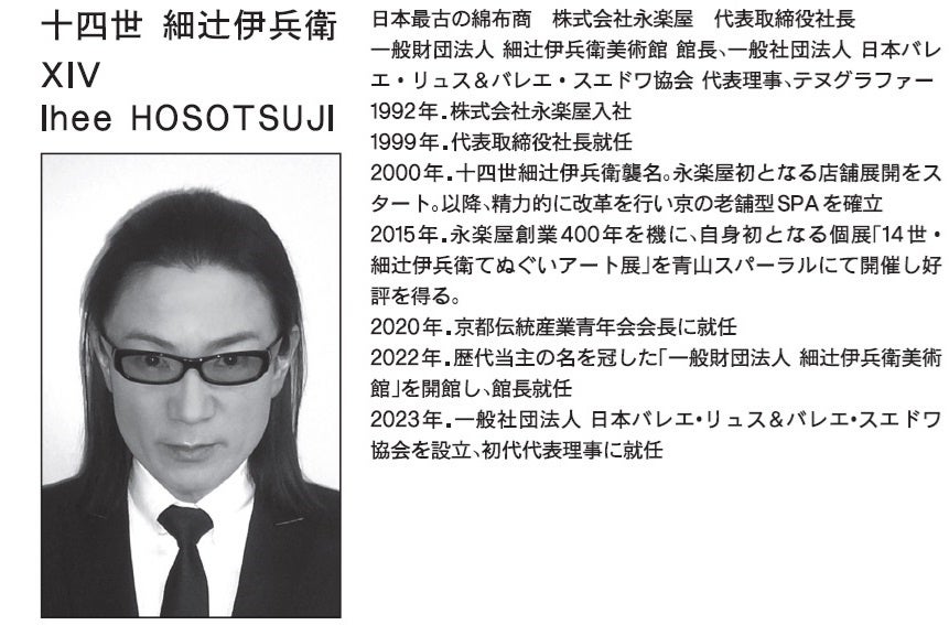 今回の「Carpe diem」は対談シリーズの第5弾です。舞踊、中でもバレエ史を中心に研究を行い、その歴史の面白さや楽しさを伝えるべく活動している舞踊史研究家の芳賀直子と、元和元年(1615年)に創業し、手ぬぐいや風呂敷をはじめとした日本最古の綿布商として400年超の歴史を誇る「永楽屋」の十四世 細辻伊兵衛の2人が、「永楽屋のコラボレーション~《ディアギレフ&マレ》誕生~」をテーマに、老舗の綿布商から何故バレエのブランドが誕生したのか?などについてのトークを展開します。
