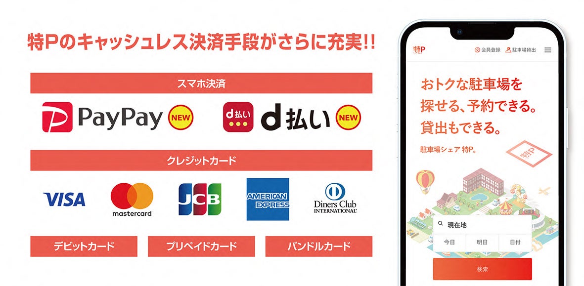 特Pの決済手段はリリース当初、クレジットカード(VISA、Mastercard、JCB)のみに対応しておりましたが、昨今の多様化するキャッシュレスニーズに応えるため、今年4月に決済クレジットカードブランドの拡充とデビットカード・プリペイドカード・バンドルカードの追加を実施しました。さらにキャッシュレス決済で近年シェアを拡大しつつある「PayPay」「d払い」を今回追加したことで、より手軽で快適に特Pサービスを利用いただくことができます。また、オーナーにとっても決済手段の拡充は駐車場利用機会の増加につながります。今後もサービスの利便性向上のため、キャッシュレス決済手段をさらに拡充していく予定です。