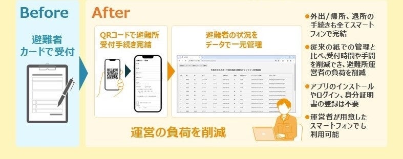 避難者情報の登録、管理をデジタル化することで、職員の事務負担を軽減し、迅速かつ正確な避難者管理を実現