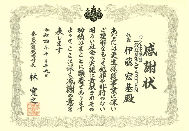 奈良県更生保護事業関係者顕彰式典において奈良保護観察所長感謝状を拝受【ワンネス財団】