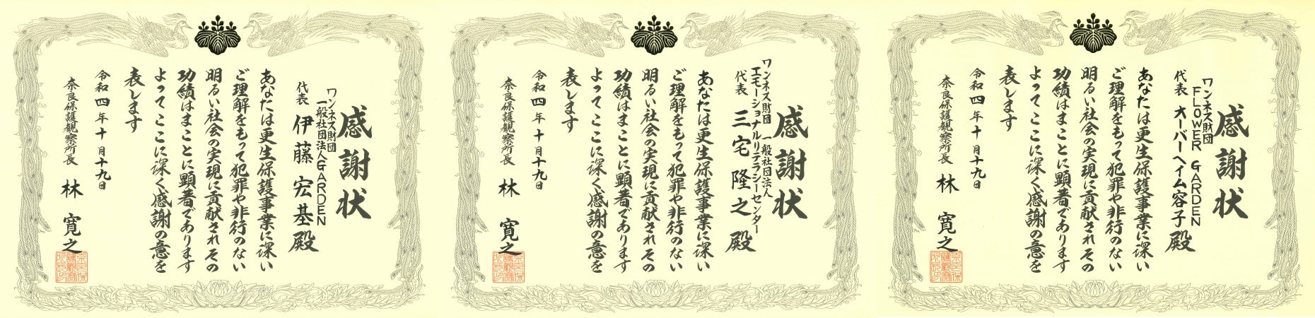 この度、再犯防止と被害者を減らすこれらの取り組みが評価され、奈良県更生保護事業関係者顕彰式典において、奈良保護観察所長感謝状を拝受致しました。当財団においては、ワンネス財団 一般社団法人GARDEN 代表 伊藤宏基、一般社団法人エモーショナルリテラシーセンター 代表 三宅隆之、FLOWER GARDEN 代表 オーバーヘイム容子へ感謝状が贈られました。