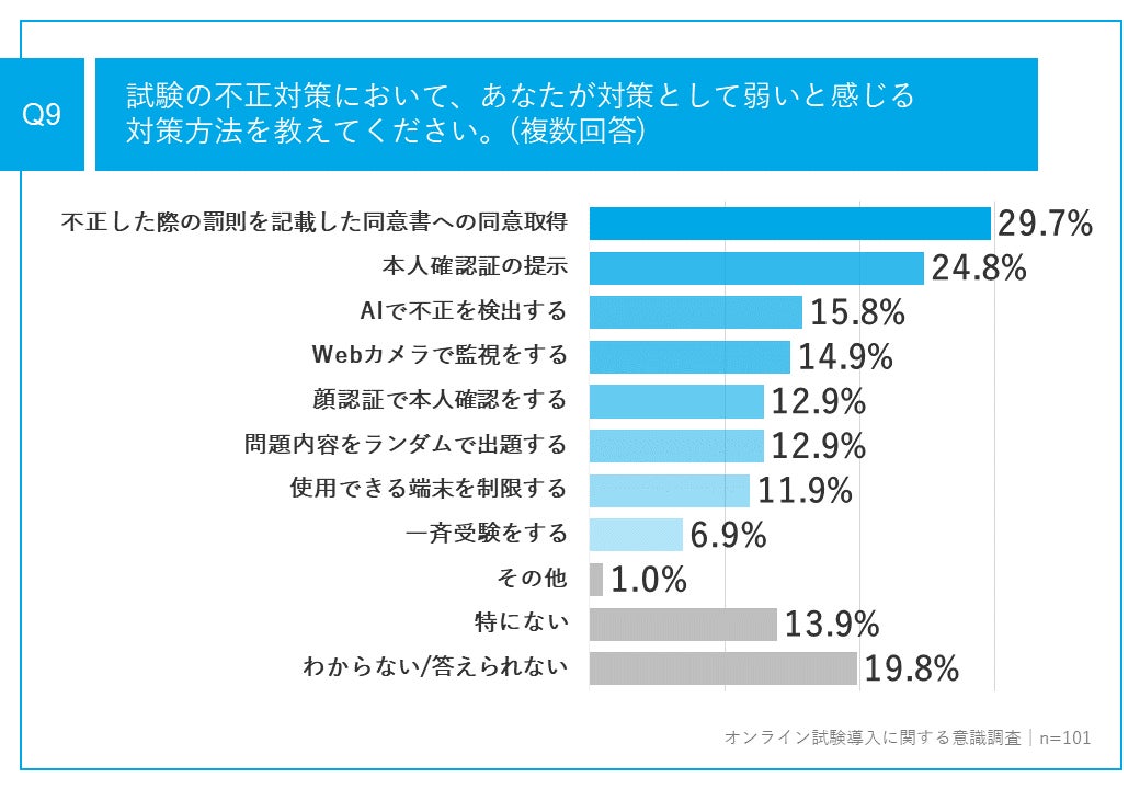 「Q9.試験の不正対策において、あなたが対策として弱いと感じる対策方法を教えてください。(複数回答)」(n=101)と質問したところ、「不正した際の罰則を記載した同意書への同意取得」が29.7%という回答となりました。