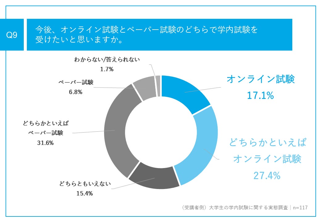 「Q9.今後、オンライン試験とペーパー試験のどちらで学内試験を受けたいと思いますか。」(n=117)と質問したところ、「オンライン試験」が17.1%、「どちらかといえばオンライン試験」が27.4%という回答となりました。