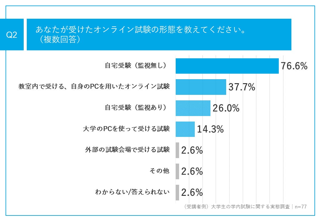 Q1で「何度もある」「数回程度ある」と回答した方に、「Q2.あなたが受けたオンライン試験の形態を教えてください。(複数回答)」(n=77)と質問したところ、「自宅受験(監視無し)」が76.6%という回答となりました。