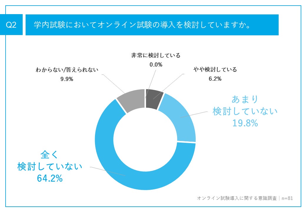 Q1で「導入していない」と回答した方に、「Q2.学内試験においてオンライン試験の導入を検討していますか。」(n=81)と質問したところ、「全く検討していない」が64.2%、「あまり検討していない」が19.8%という回答となりました。