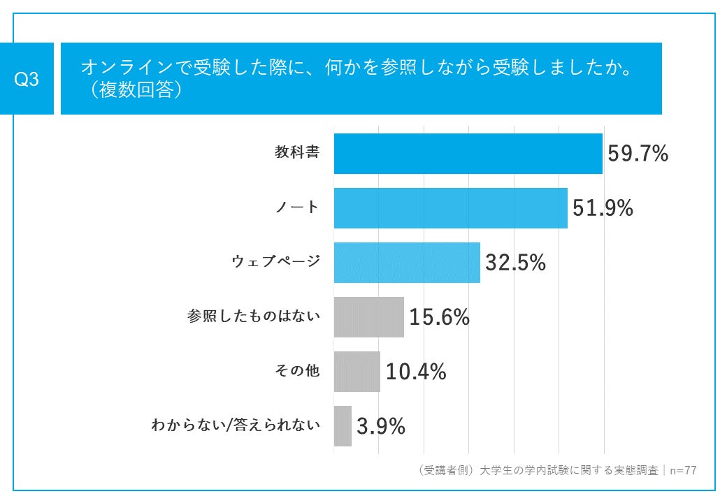 Q1で「何度もある」「数回程度ある」と回答した方に、「Q3.オンラインで受験した際に、何かを参照しながら受験しましたか。(複数回答)」(n=77)と質問したところ、「教科書」が59.7%、「ノート」が51.9%という回答となりました。