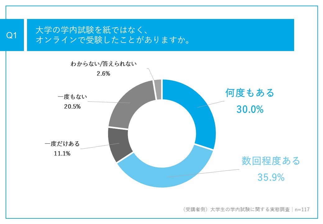 「Q1.大学の学内試験を紙ではなく、オンラインで受験したことがありますか。」(n=117)と質問したところ、「何度もある」が30.0%、「数回程度ある」が35.9%という回答となりました。