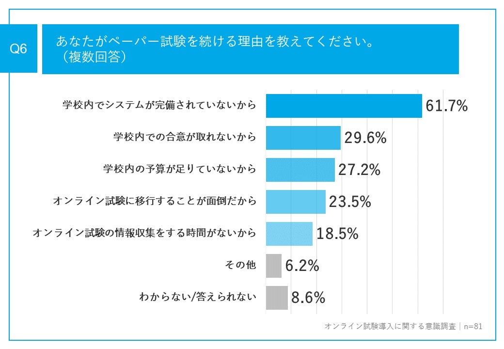 Q1で「導入していない」と回答した方に、「Q6.あなたがペーパー試験を続ける理由を教えてください。(複数回答)」(n=81)と質問したところ、「学校内でシステムが完備されていないから」が61.7%という回答となりました。