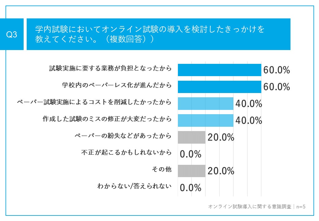 Q2で「非常に検討している」「やや検討している」と回答した方に、「Q3.学内試験においてオンライン試験の導入を検討したきっかけを教えてください。(複数回答)」(n=5)と質問したところ、「試験実施に要する業務が負担となったから」が60.0%、「学校内のペーパーレス化が進んだから」が60.0%という回答となりました。