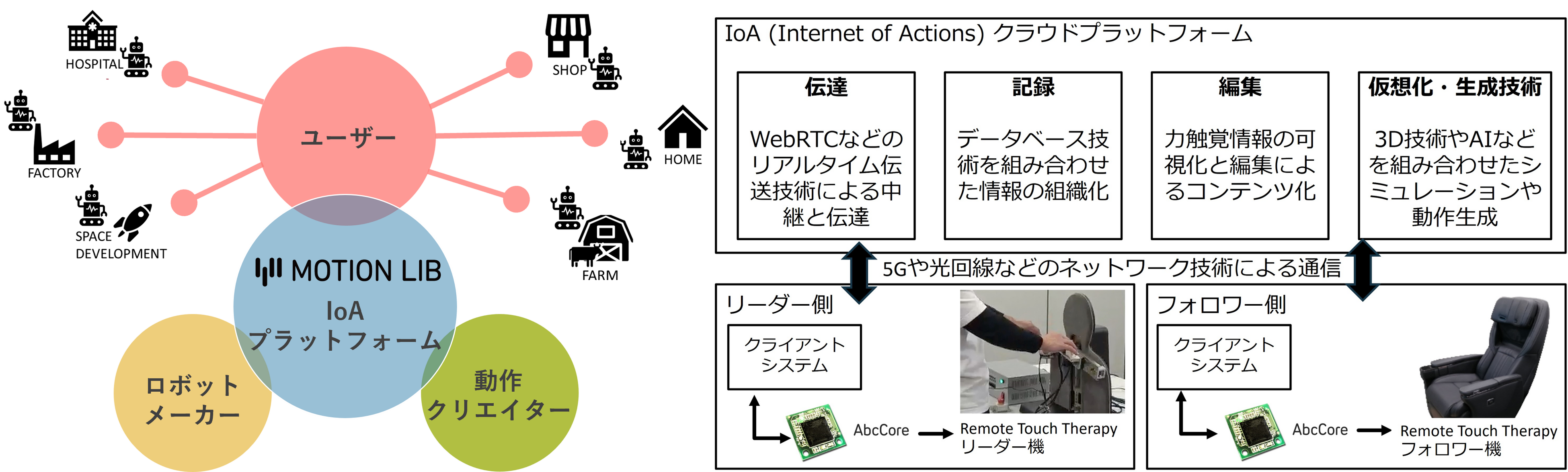 モーションリブは現在、取得されたデータを活用した仮想空間でのシミュレーションやAIによる動作生成などを開発しています。リアルハプティクスと仮想化技術を組み合わせ、様々なロボットがインターネットやコンピュータリソースを通じて行為(Action)を蓄積し、多種多様なニーズに対応することができるコンテンツを生成する「IoA(Internet of Actions)プラットフォーム」の実現を目指しています。