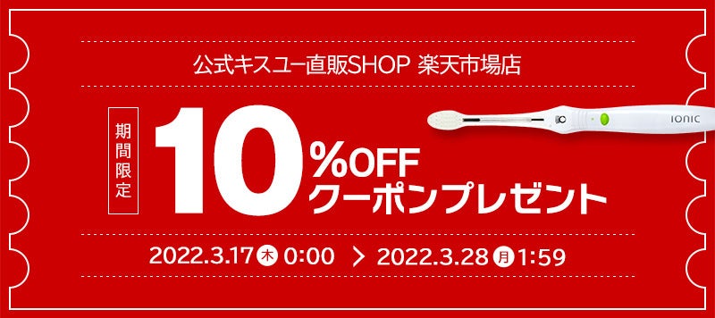 イオン歯ブラシのリーディングカンパニー【イオン歯ブラシ累計販売本数2億本以上の実績】であるアイオニック株式会社(所在地:千葉県流山市、代表取締役:西川 満、以下「アイオニック」)は、2022年3月17日(木)0:00~2022年3月28日(月)1:59まで公式キスユー直販SHOP楽天市場店で【期間限定10%OFFクーポン + ポイント10倍】プレゼントキャンペーンを開始いたしましたので、お知らせいたします。