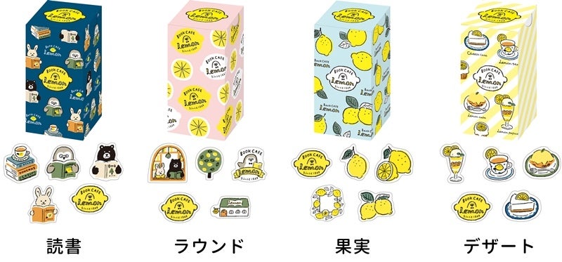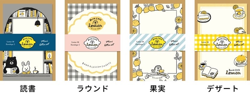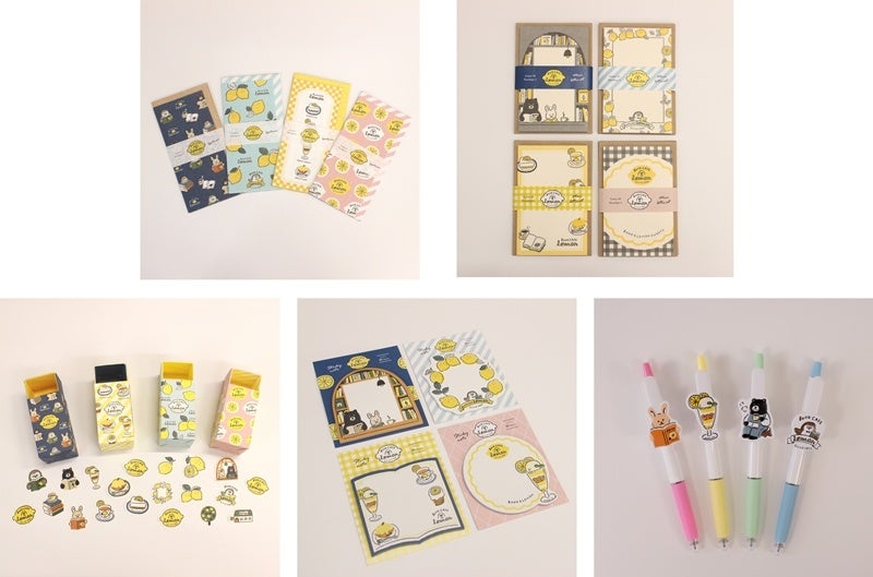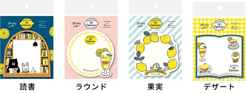 「檸檬書店 BOOK CAFE LEMON」の第一弾は、一筆箋、ミニレターセット、フレークシール、ダイカット付箋、ボールペンの5アイテムで、それぞれ4パターンのデザインで展開いたします。