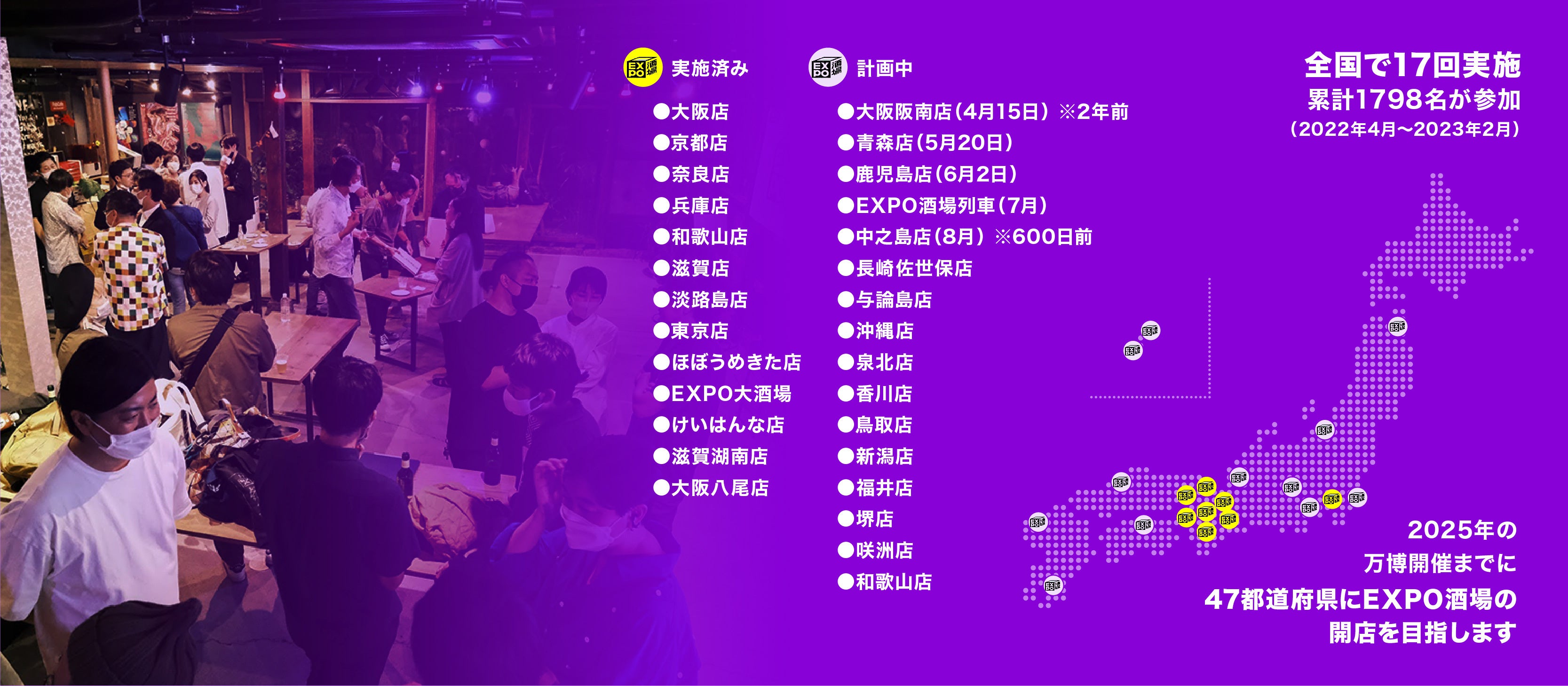 2022年春から始まった、大阪・関西万博に興味がある人、参加したい人々が集まり語らうイベント「EXPO酒場」を全国で開くプロジェクト。「万博への参加」のハードルを下げることで、最初の一歩を踏み出してもらうことが目的です。万博関係者と一般人が分け隔てなく意見を交わす交流の場となっており、ここから様々なプロジェクトが生まれています。