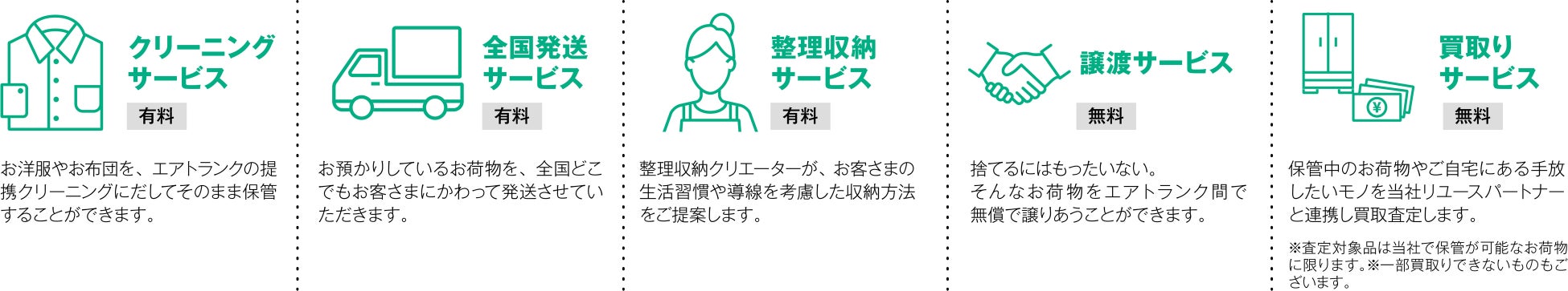 さらに、ただ荷物を預かるだけでなく、クリーニングや全国への発送代行サービスなどのコンシェルジュサービスや、不要になったものはエアトランクの会員間で手間なく無償譲渡できる仕組みや買取りにも対応しています。
