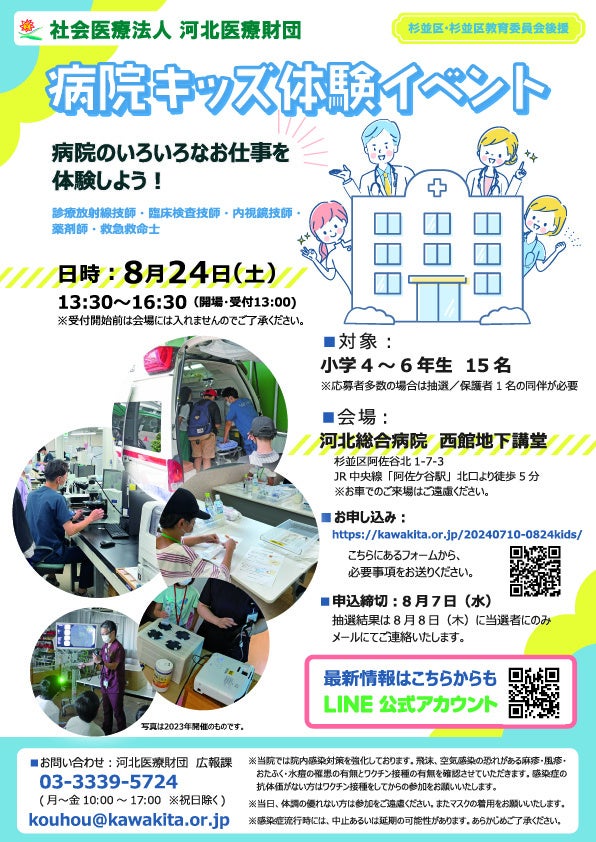 社会医療法人 河北医療財団 (所在地:東京都杉並区、理事長 河北 博文) は、子ども向け「病院キッズ体験イベント」を開催いたします。